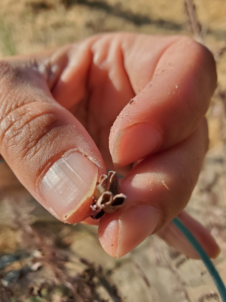 I shuttered with delight as I walked out into the cold air, overalls on, before the sun came up and with all intent to finish planting before the rain began. At a time in the past, one of the biologists told me that there was some evidence that 2 to 3 year old California milkweed seed had higher germination rates. In 2023 and 2024, the seed pods I saved from the ravages of the grasshoppers were intended for planting a year or two or three later. The 2023’s were maintained in a cool, dry, dark place for a nearly 2 years. The 2024’s were were maintained the same, but for just two seasons. I brought them both with me, including my trusty small rake.