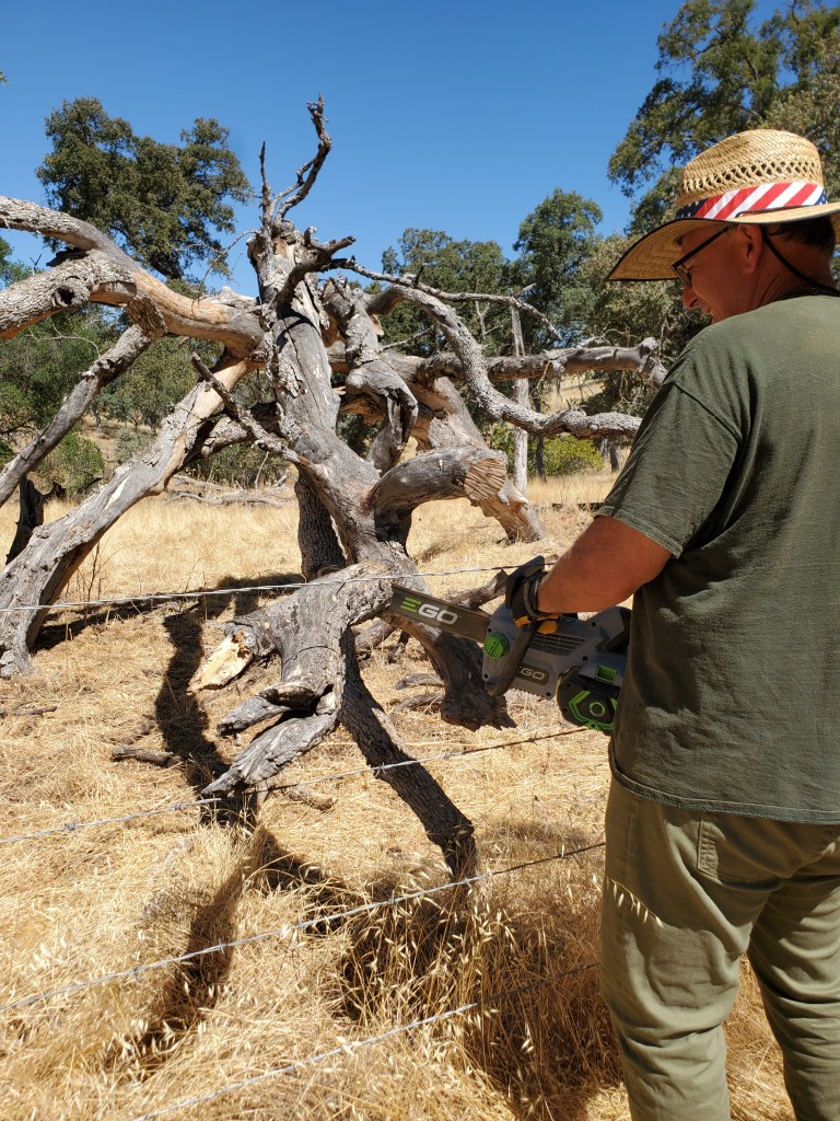 As noted in the passage above about narrowleaf planting, an oak branch had fallen on my exclusion fencing. The storm had also knocked down some branches and trees across the neighbor’s section of the cattle road. David and I ended up doing a bit of chainsaw work too.