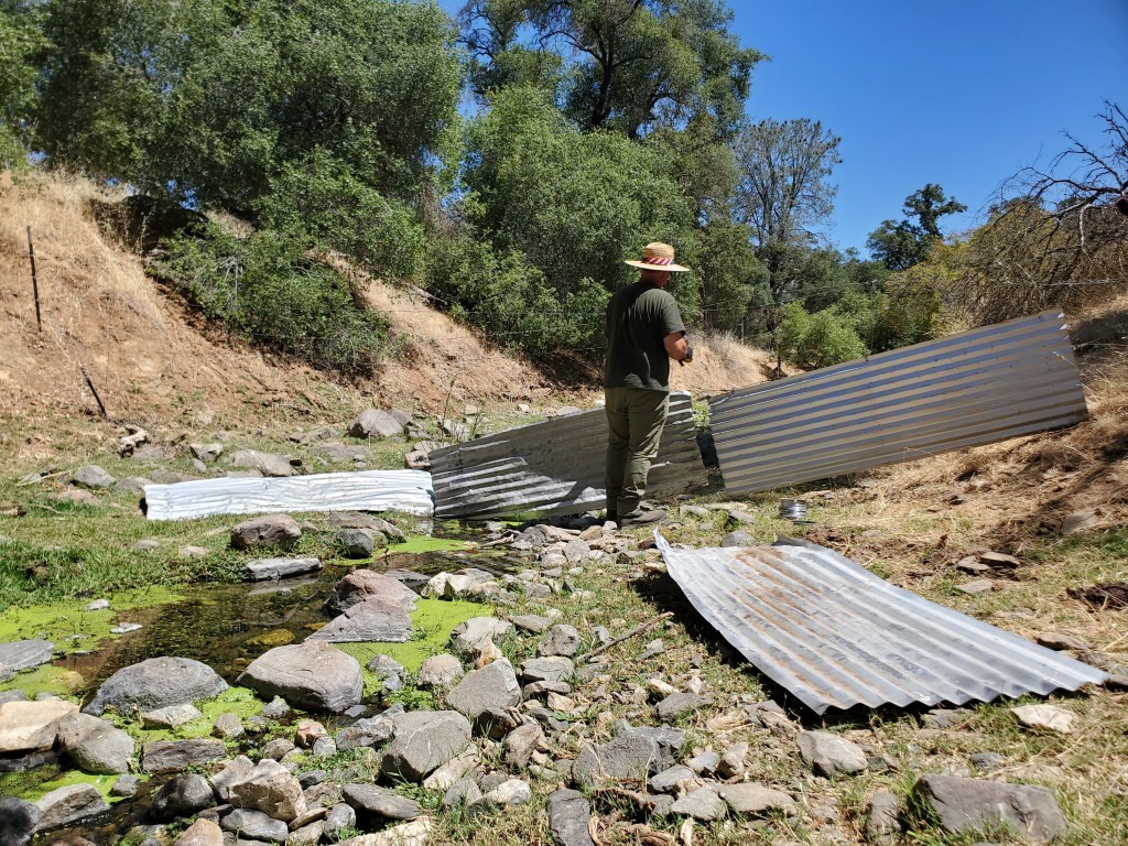 One of our ongoing projects has been to create a fresh, ongoing supply of water to the wildlife guzzlers. Recall, we built a small overhang over the guzzlers to catch more rainwater than if they were left out on their own with their beveled tops. The overhang also acts as shade to decrease evaporation from the unit. Some years, the water captured lasts the entire year. During droughts, the water has run out by late August. To prevent running out, but to also inflow more fresh water, we are building a larger rainwater catchment up hill to gravity feed into the guzzler. The tank is 1500 gallons and will be under a metal building to protect it from sun exposure and heat gain. David has been working on it and will likely be done a week from this post. I am very excited to keep water flowing throughout the hot months. The guzzler has become a very busy place with ground and song birds, raccoons and one feisty feral cat. Thank you to the Natural Resources Conservation Service (NRCS) EQUIP program, US Fish and Wildlife Partners Program and Point Blue Roots Program for believing in this work and supporting it.