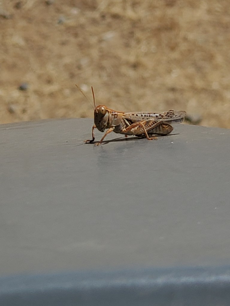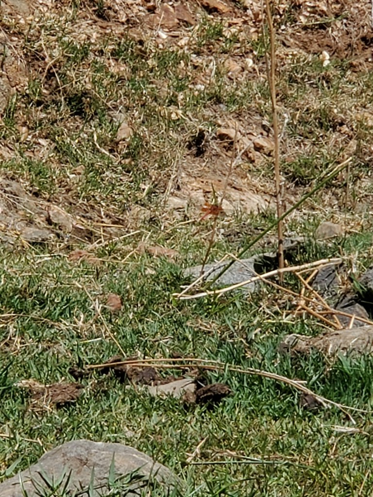 Green dragonfly on rockHard to see – red dragonfly center image on vertical stick Three of the covey of 20 quailSnake skinCool looking flySierra chorus frog – I’ve seen quite a few around the houseMeadowlarkMy respected nemesis, Grasshopper. Truly a remarkable creature