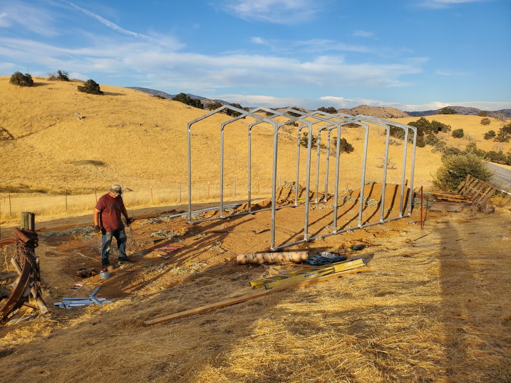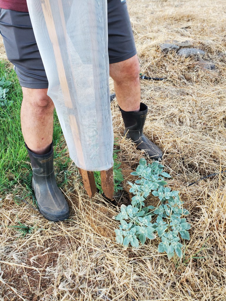 David and I have finally got all of the oaks caged. When the cows return from the south end of the ranch, the oaks are now protected. I had planted them well before the caging was done, and some of them had been stepped on or bent from hungry cow heads exploring their ability to access the tasty acorn and tree. The trees are small enough that the tallness of the basket protected them. That said, I needed to do a bit of reshaping before caging the area around the plant. We followed a new protocol for caging that Alex Palmerlee, an oak expert in Butte County follows. We used much stiffer cow panel fencing at at length of 8′ and a height of 50″ secured to two t-posts. Previously, we used no-climb fencing at a thinner gauge with a much larger diameter. The thinness required three t-posts to secure. I think this new method will require less resources and be more resistant to pushing in from the cows, thus OK to have a shorter diameter. Thank you to my long-suffering husband for doing the major share of the caging work. After I maintained the oak planting site by weeding, re-situating coir pads and “fluffing” the baskets back to their original shape, David would follow with the caging. I had already set out the t-posts for him, and he brought the panels. We make a pretty good team.