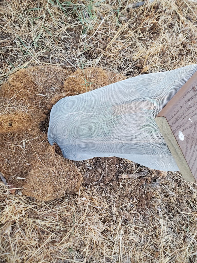 Using my trimming tool to cut the grass from around the basketsAll done. Nice and open!This guy did not make itA completed coir pad installation on one monarch habitat plotStaging the materials and tools for the work