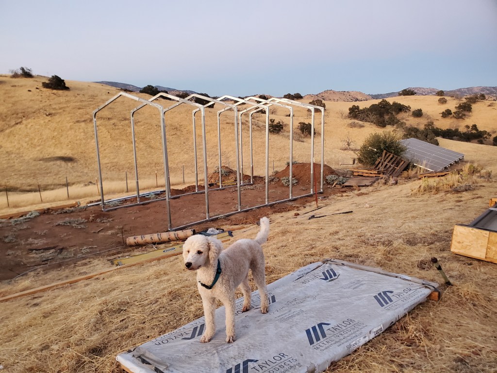 Ranch poodle Pongie plays on the suppliesDavid gets trusses erectedPrepping the holes for cementRacoon visits guzzler for a slurpMockingbird hops in for a drink