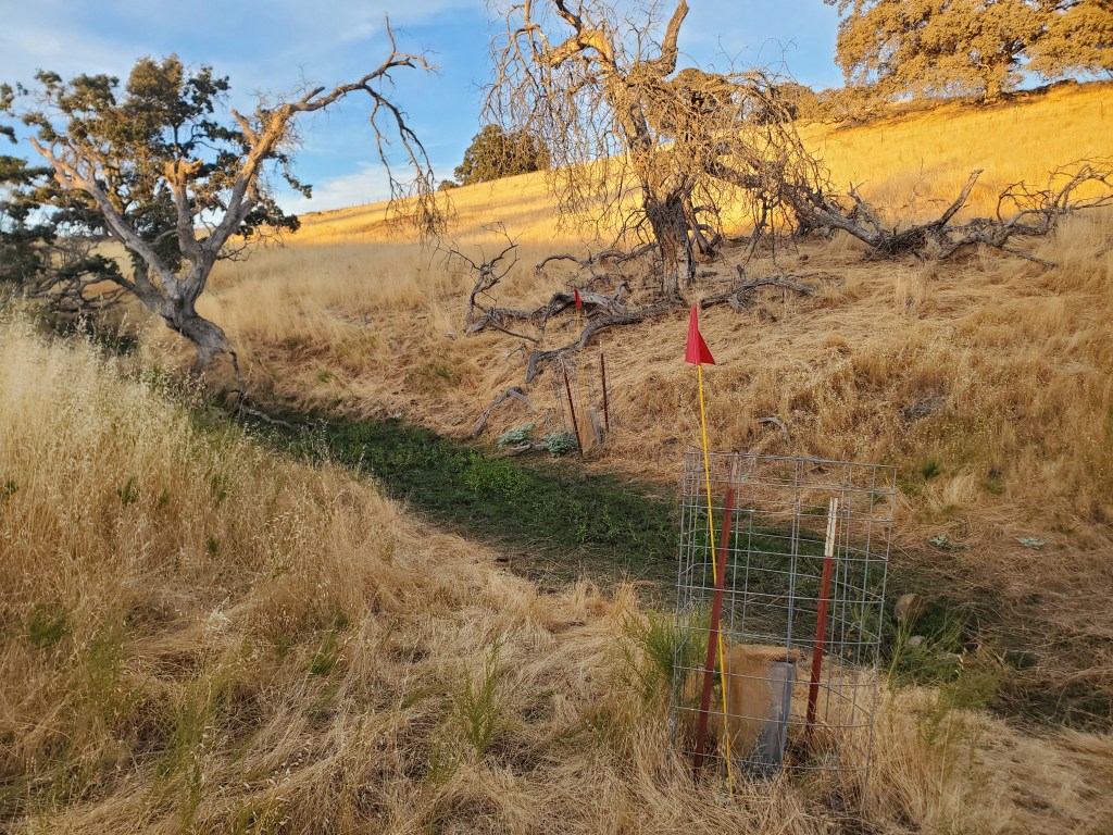 I have accelerated my work getting seedlings and acorns in the ground. With the challenges of life, I’ve not had enough time to spend. Fortunately, the ground was still soft from prior rains. It was easier to work with. Most seedlings required gopher protection. This means digging 18″ +/- holes in which to place specially designed cages with soft wooden bottoms that are long enough to allow the lengthy oak taproot to grow. The wood bottoms have holes for drainage and root movement. Conceptually, the soft wood bottom will rot in a year or two, opening up more space for the roots to thicken and become resilient.