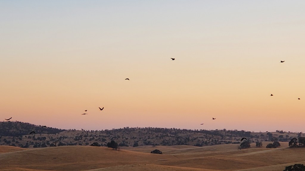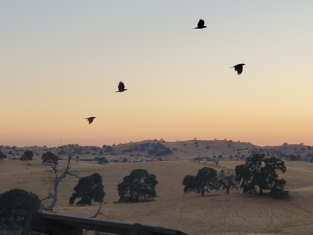 Tarweed, with its most incredible of smells, is bursting all around. Its first blooms tell me that Fall is near. Acorns are dropping, some with the almost neon green of youth and others with the dark brown of maturity. The wind has been knocking them out of the tree, too soon for some and just right for the others. Then, we have been witnessing the nightly spectacle of a thousand ravens fly from the valley to the foothills on their dusk time commute to roost safely somewhere up hill from us. David and I have been sitting on the front patio to watch this massive nightly migration. You can hear the wings flapping before you see them. It is incredible. We are waiting to begin seeing the tarantulas. This is the one harbinger of Fall that we have not seen yet. Probably soon!