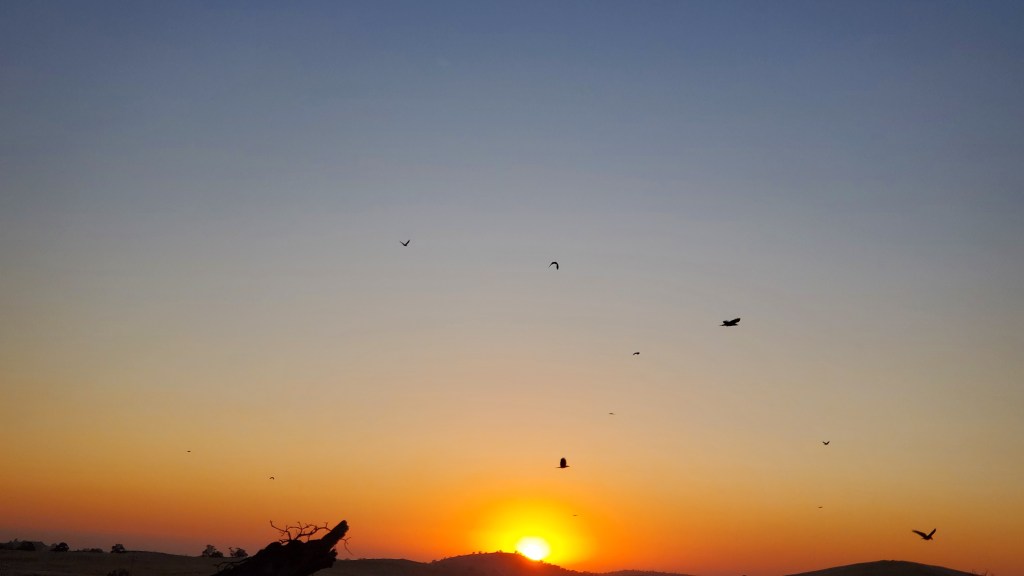 There are still no raptors, ravens or vultures in the sky. This time is for the songbirds to flit and sing with less concern of being a meal or their eggs being a raven’s meal. I link up with the cattle road and make a turn north, fully surrounded by the large expanse of grassland. I hear the unmistakable song of the meadowlark, deeee, de de de deee, then as the sky brightens, coyotes begin to sing. As I get closer to the driveway, there is the distant rumble of cars on the road, which is a quarter mile away. The sun has woken humans up too. I continue the last leg of my walk, Millie by my side and Beatrix taking the short-cut through the grassy hill. I feel grounded and filled. This walk is a ceremony of connection, an acknowledgement that we are all together, living for one another.