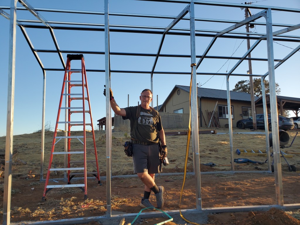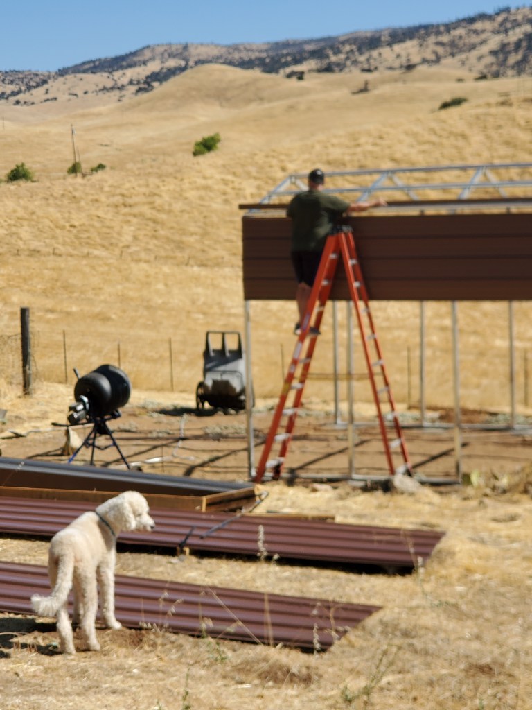 Ranch poodle Pongie plays on the suppliesDavid gets trusses erectedPrepping the holes for cementRacoon visits guzzler for a slurpMockingbird hops in for a drink