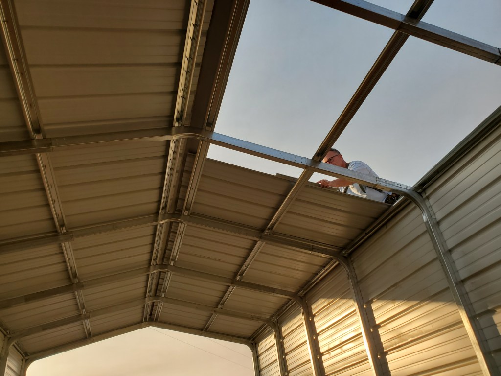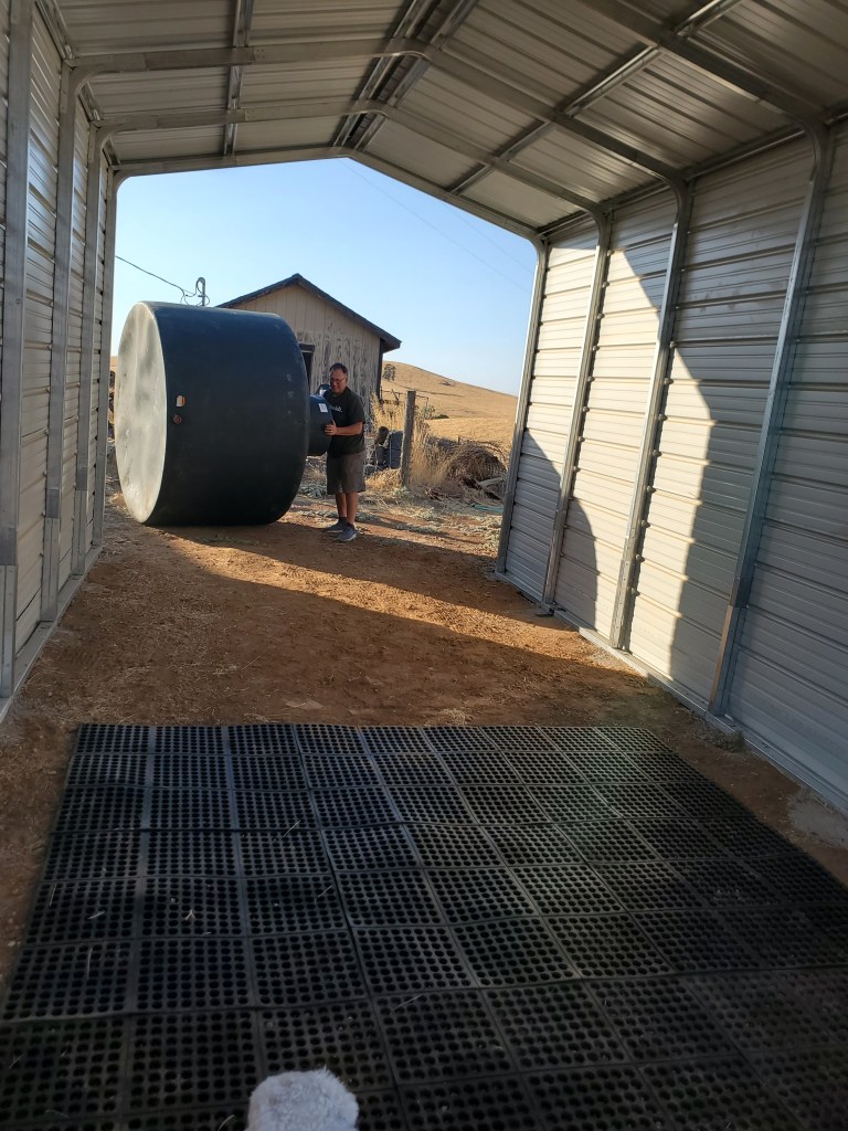 David has been busy at work on the metal building to be used to shelter tanks and collect rain water for the guzzler. I oversized it to eventually include a larger volume tank that will irrigate my next project of establishing a field of native grasses. For now, the shed holds a smaller 1,500 gallon tank to keep fresh water in the wildlife guzzler. We installed stainless steel mesh gutter screens to improve the quality of the rainwater catch. Although we took the flat area to hardpan and David and I both raked the ground to clear rocks, there were still quite a few rocks embedded in the hardpan. In order to prevent water tank punctures from those rocks, we chose to install a rubber mat floor to be a barrier between the tank and the rocky surface. Remember, water weighs 8.34 lbs per gallon. Full, the tank will weigh 12,510 lbs. That would be a lot of downward pressure onto those rocks. I want to say a very public “Thank you” to David for his tremendous work on building this building for me. It came out great and will yield up to 2,302 gallons of rain water in an average precipitation year.