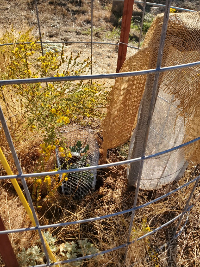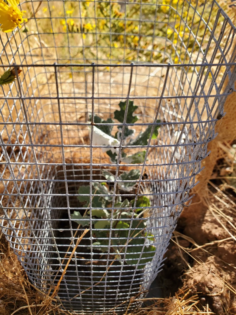 David and I have finally got all of the oaks caged. When the cows return from the south end of the ranch, the oaks are now protected. I had planted them well before the caging was done, and some of them had been stepped on or bent from hungry cow heads exploring their ability to access the tasty acorn and tree. The trees are small enough that the tallness of the basket protected them. That said, I needed to do a bit of reshaping before caging the area around the plant. We followed a new protocol for caging that Alex Palmerlee, an oak expert in Butte County follows. We used much stiffer cow panel fencing at at length of 8′ and a height of 50″ secured to two t-posts. Previously, we used no-climb fencing at a thinner gauge with a much larger diameter. The thinness required three t-posts to secure. I think this new method will require less resources and be more resistant to pushing in from the cows, thus OK to have a shorter diameter. Thank you to my long-suffering husband for doing the major share of the caging work. After I maintained the oak planting site by weeding, re-situating coir pads and “fluffing” the baskets back to their original shape, David would follow with the caging. I had already set out the t-posts for him, and he brought the panels. We make a pretty good team.