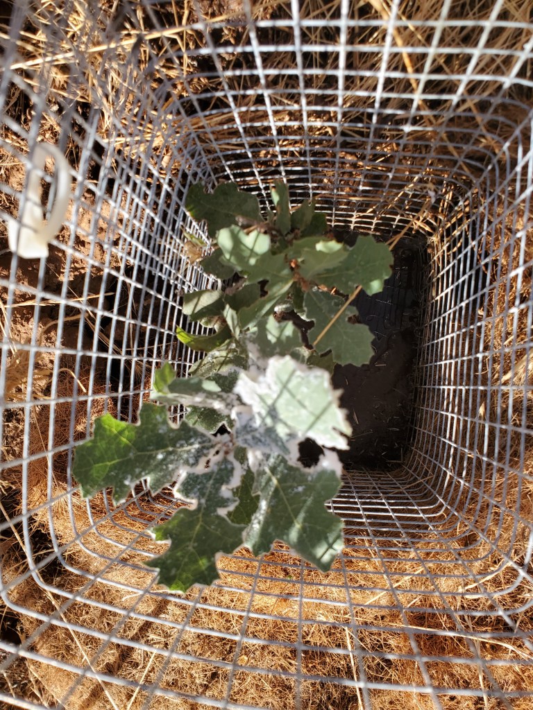 Oak seedling with roots eaten by gophersGorgeous oak covered in fungusAnother view of fungusClose up of fungusRemoving all covers on the trees so they can breath more