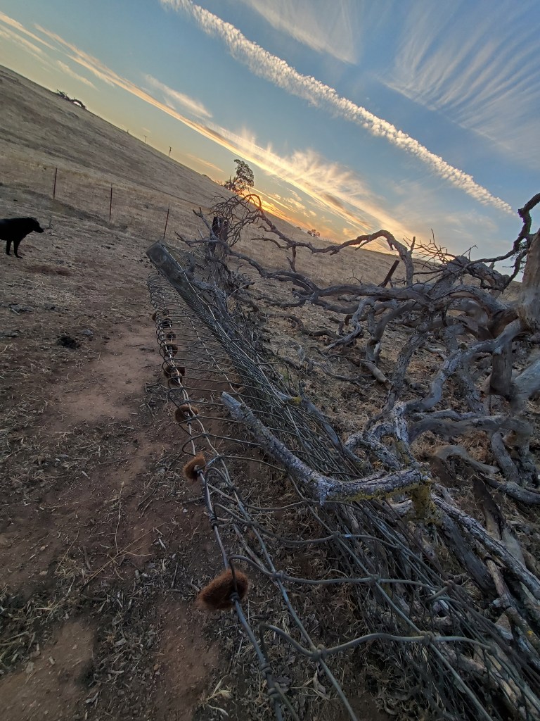 Although I have relaxed more with the fencing in place, catastrophes can still happen. Three times now I have gone outside to find cows where they shouldn’t be. Once, they jostled the gate open to the far north field. They jostled the gate open to guzzler 1, and yesterday I found them in the Spring Creek exclusion area. The wire gate had been squished down. In all cases, my heart sunk with concern that all I worked for could be lost in one accident with a poorly structured gate lock. Things were ok with the far north field. The Ca Milkweed was fine, and not too many of the blooms were up to be eaten. Guzzler one sustained significant damage. The solar panel connected to the game camera was severed. The wire had been snipped and stomped on. The stainless steel mesh over the gutter was folded up on both ends in tortuous fashion. Fortunately, we have an extra panel with wire and more gutter screen. We can fix that. I have yet to assess the damage to the exclusion area where large lupines, oak seedlings and larkspur are all just getting ready to develop blooms. It would be a catastrophe of large proportion if much of that was destroyed. In all cases, I secured the gate locks with a carabiner (cannot be licked open), twisted wire (cannot be jostled open), and a second loop securing the wire gate.