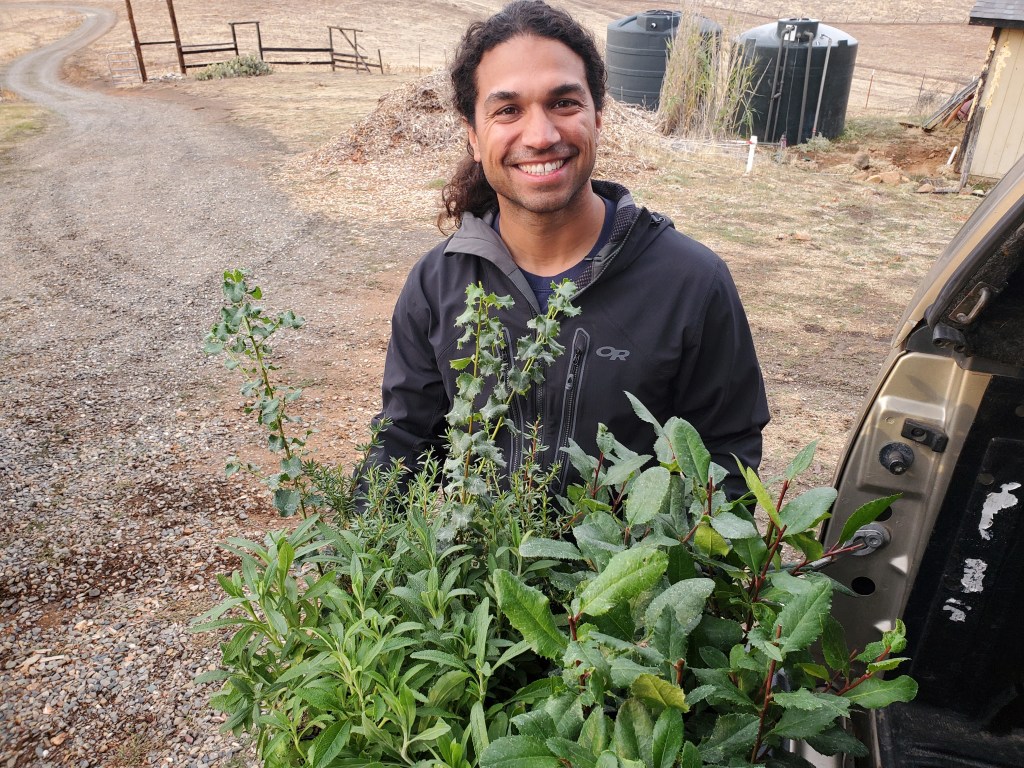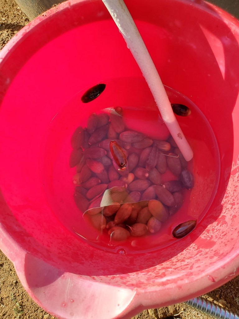 I planted all of the oak seedlings except one, planted all of the riparian oak acorns, and planted half of the elder oak acorn. The rest of the elder oak acorn I saved for acorn flour. I checked the plantings done earlier in the month and February. The cows got their snouts through the fencing on one and pulled the coconut coir. I put it back. Some of the flags were askew. I straightened them. I placed flags on others. I weeded away from new growth in the already enclosed plantings. Maintenance is important to ensure better outcomes.
