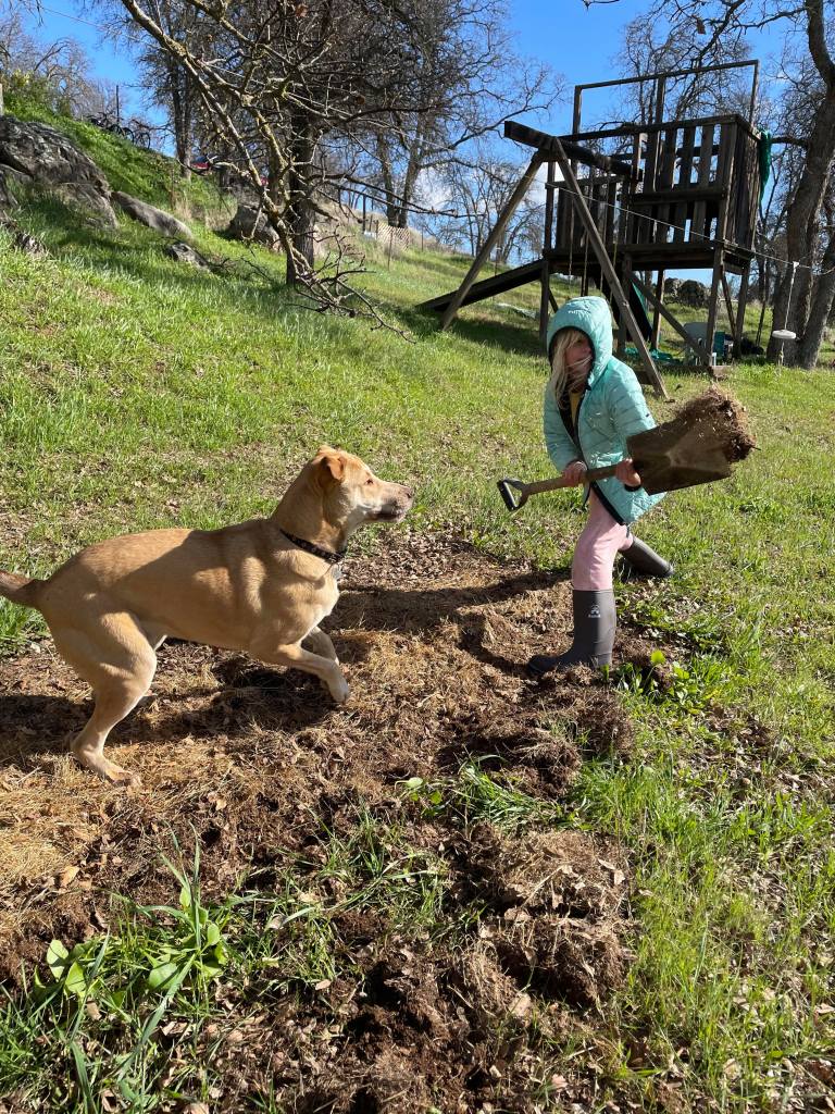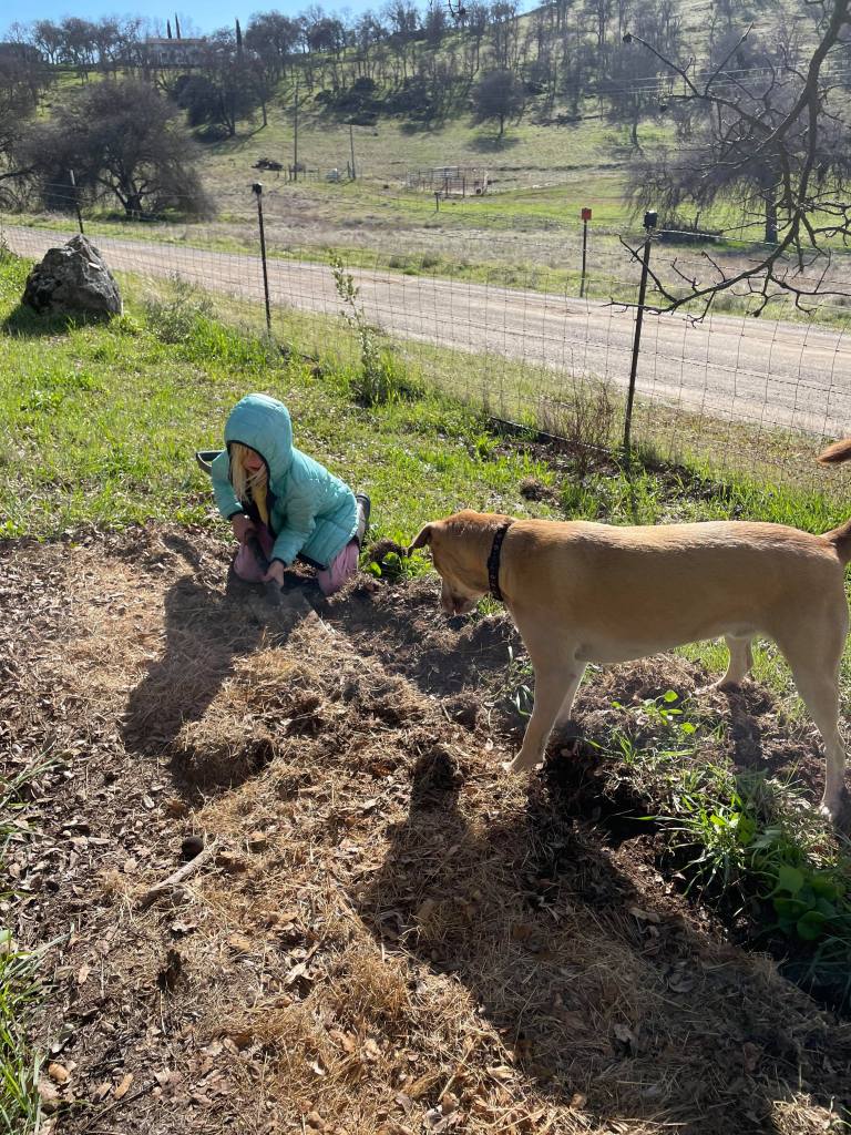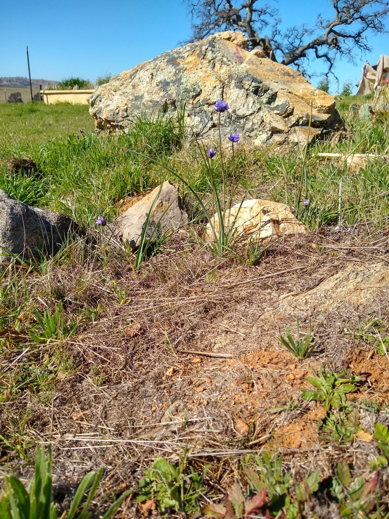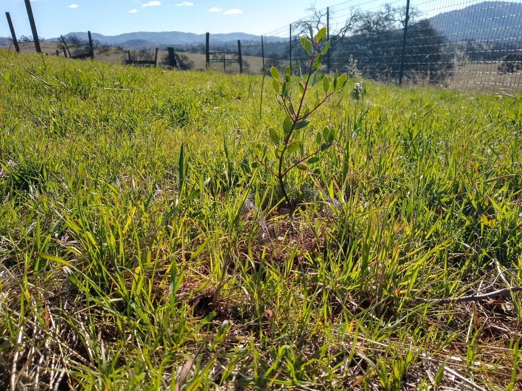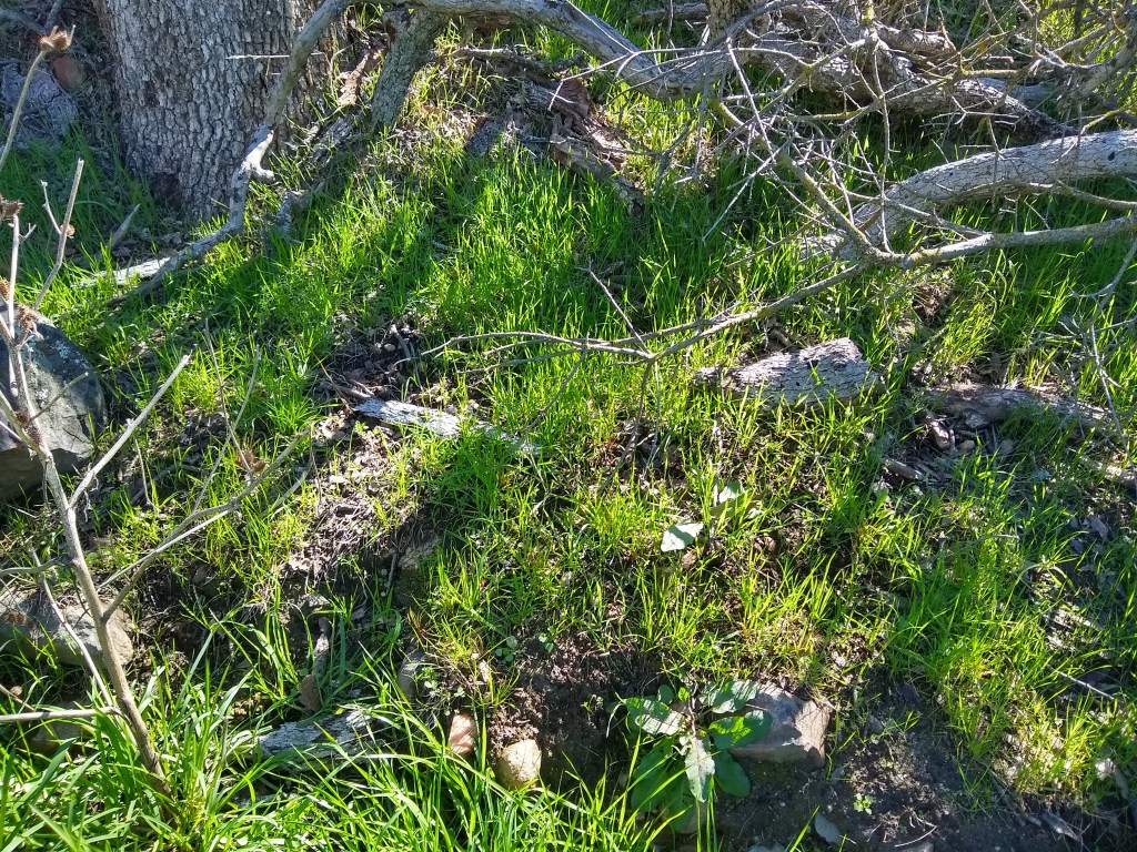 We have a proliferation of white lupine, yellow mariposa lilies and purple brodiaea. Also near the creek, one showy milkweed and one narrowleaf milkweed have returned from the original 7 planted in 2020 that the wild pigs turned up. They look strong and healthy. One golden current and a mugwort survived the breach of the branch fence. The mulefat is coming back after being browsed a while back. There are other plants I have not been able to ID yet. I planted the riparian Xerces kits along this creek – so I am not quite sure what things are. I think, for most of the plants, there needs to be more moisture, a slight flooding event, to get the roots going. I believe my limited watering is not enough to get them started. Maybe next year. Happily, the oak seedlings made it through the browsing. They all look strong and healthy.