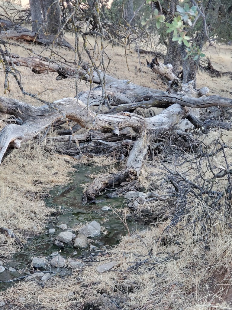 For every hour I spend outside, I am inside two. Not only do I spend hours at my computer writing this blog, I have to work on ag reports for the county, water rights reports for the state. I am so behind in implementing grants I have for water storage and tree planting projects, and I need to get the materials and supplies together for those. David and I went to check on the site of the second guzzler. We had to go through a forest of downed branches to get there, which made me remember I also wanted to plan a prescribed fire in my enclosed areas. There is so much planning, research and writing.