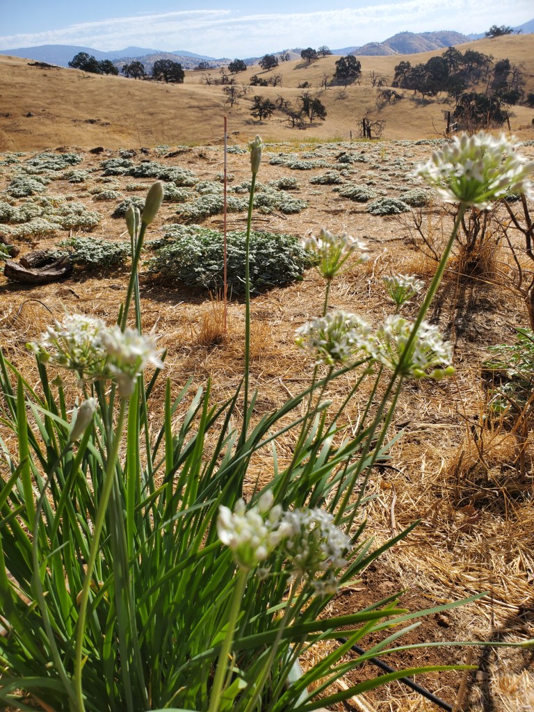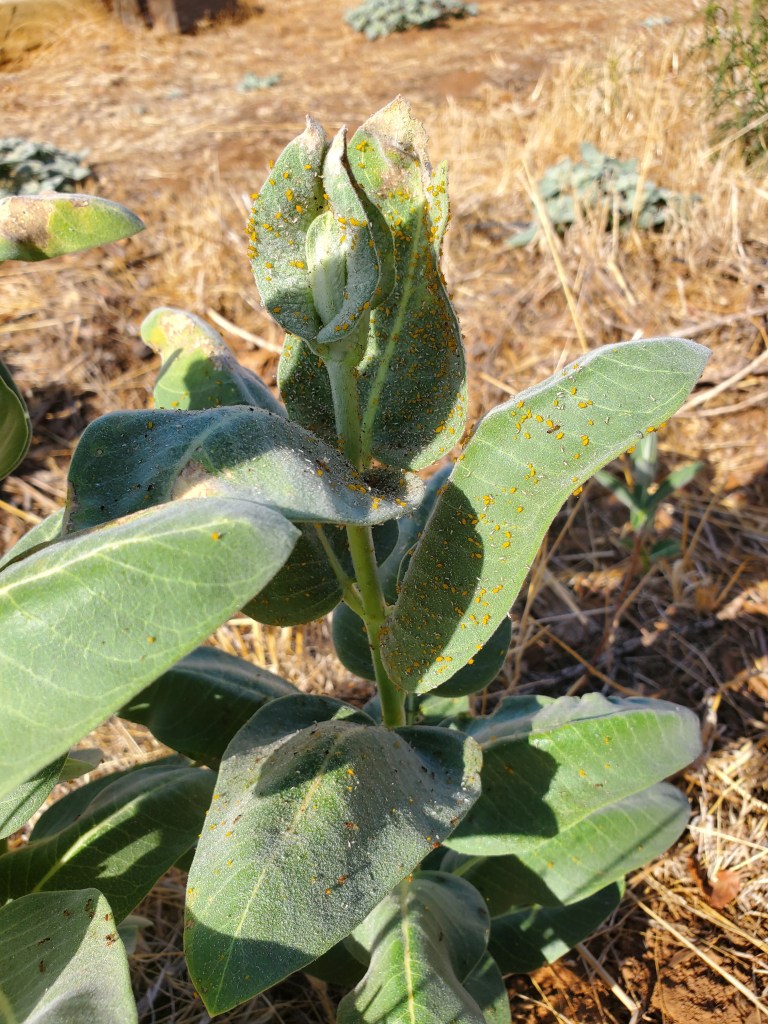 I shuttered with delight as I walked out into the cold air, overalls on, before the sun came up and with all intent to finish planting before the rain began. At a time in the past, one of the biologists told me that there was some evidence that 2 to 3 year old California milkweed seed had higher germination rates. In 2023 and 2024, the seed pods I saved from the ravages of the grasshoppers were intended for planting a year or two or three later. The 2023’s were maintained in a cool, dry, dark place for a nearly 2 years. The 2024’s were were maintained the same, but for just two seasons. I brought them both with me, including my trusty small rake.