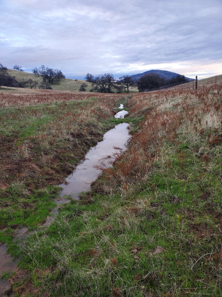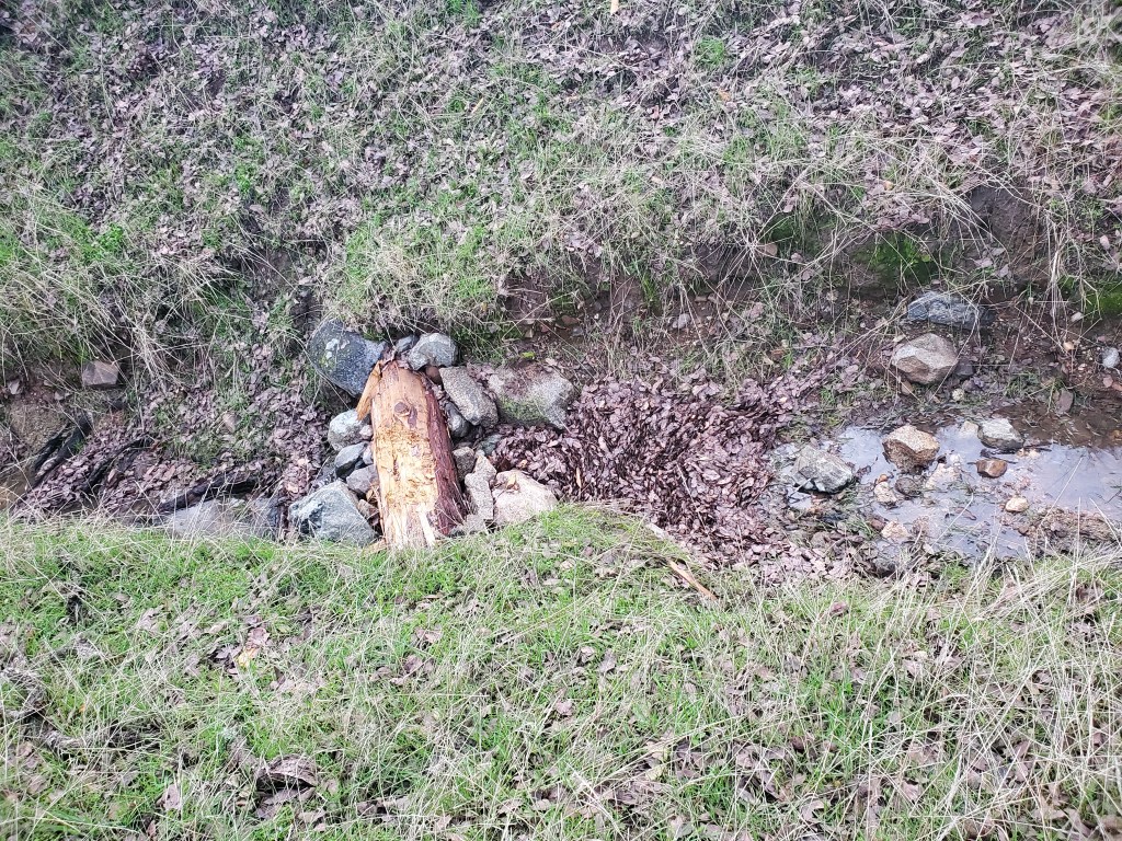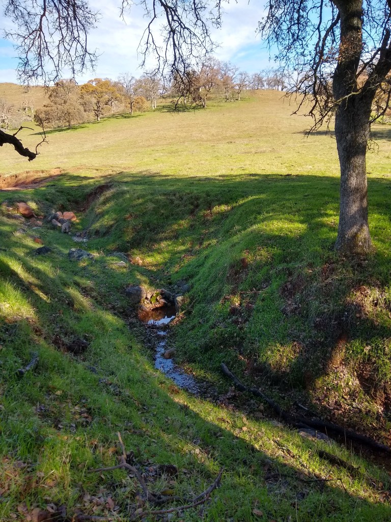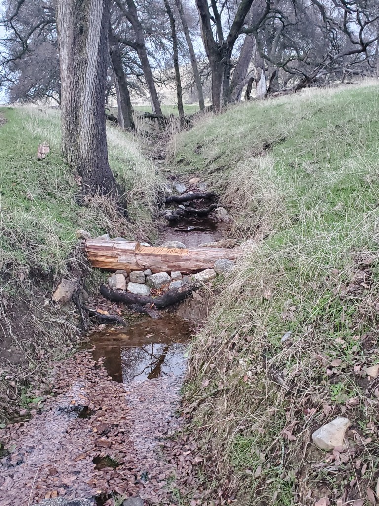 It was a joy to have cold weather and storms, with the most recent one being very large. Water is life, and life is omnipresent and happy when water is around. After the storms, I check my dams to see how they are doing. Everything is holding in place, even my little rock check dam. You see the water, when the creek is running slowly, backing up as intended. I will be placing another dam below that one to slow more water and hopefully spread it out a little to soak the ground and make it more hospitable for oaks.
