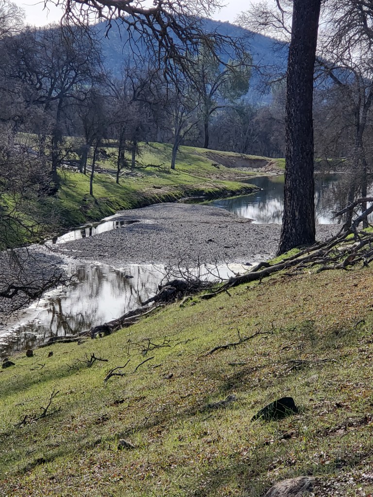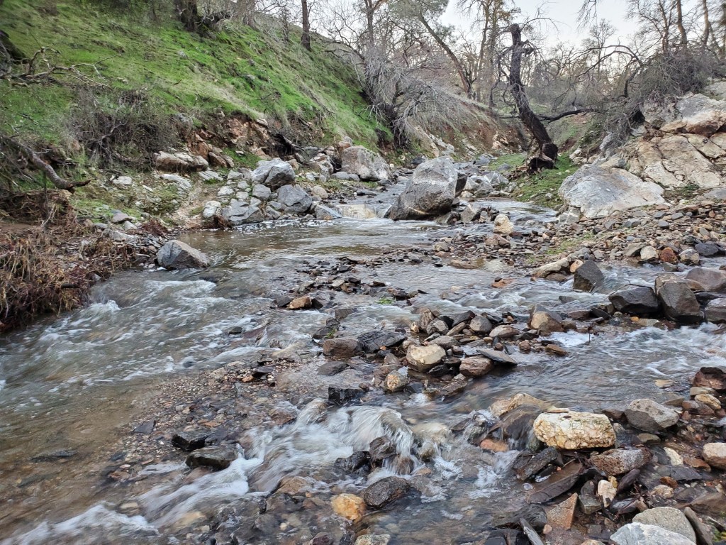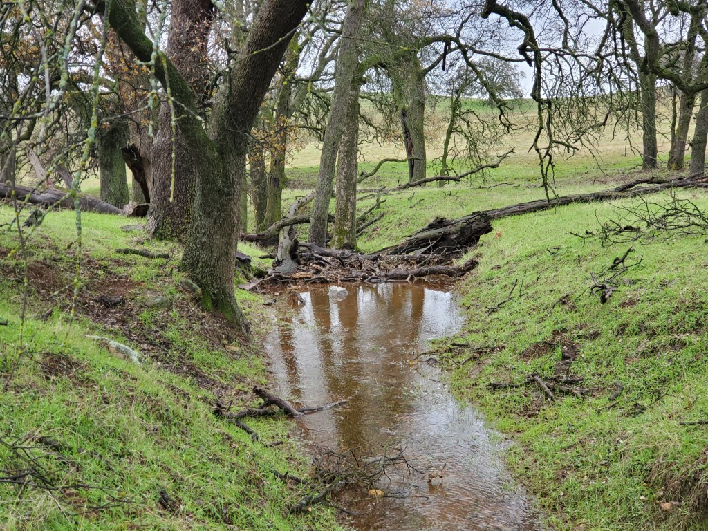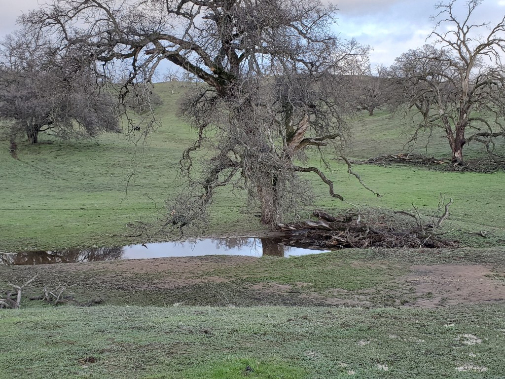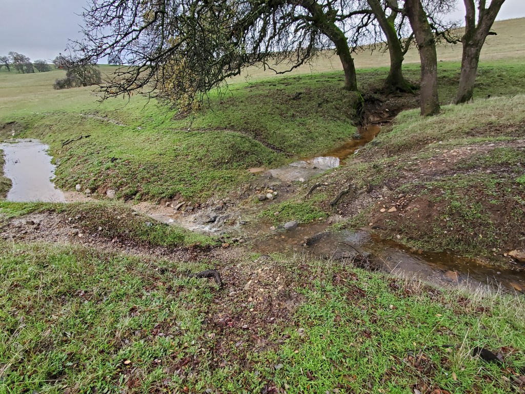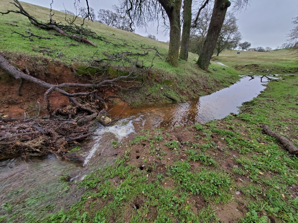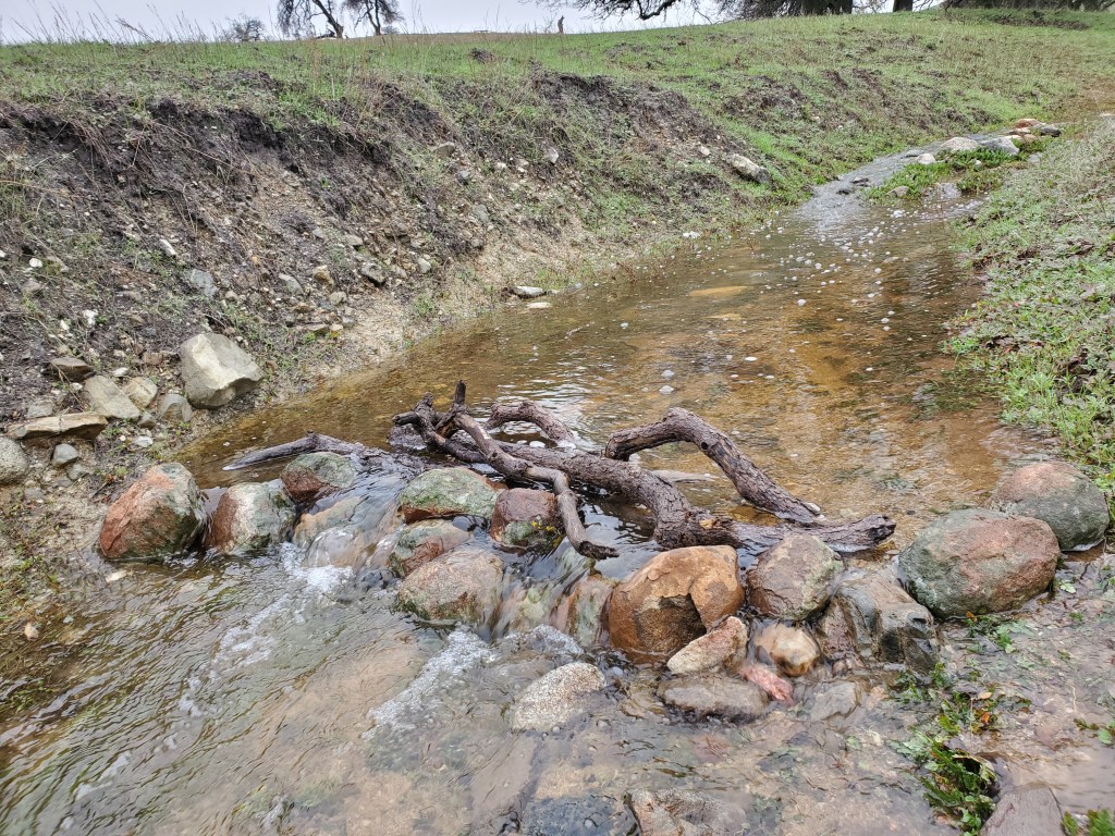 On my walk up stream, I found a few cowpies in the creek. This is not good. It adds significant organic matter/nutrients into the water, which promotes algae blooms when the temperatures warm, diminishing the water quality. I scraped some earth up the bank, put seed in, covered it lightly, then took the cow pie out of the water and placed it on top of the seeds. I got this idea from a California Association of Resource Conservation District conference session in December. It was a session on oak recruitment on rangeland with Kurt Vaughn and Alex Palmerlee. One of the tools they used in providing nutrients to acorn plantings was a slurry of cowpie and water. The audience could not stifle their amusement as the guys discussed the delight they had in mixing cow poo with water to make a mulch. Definitely gross to some. If it works better, what an abundant resource on ranches.