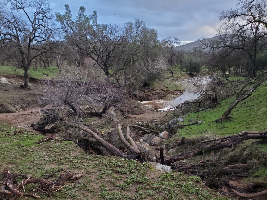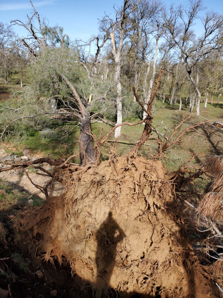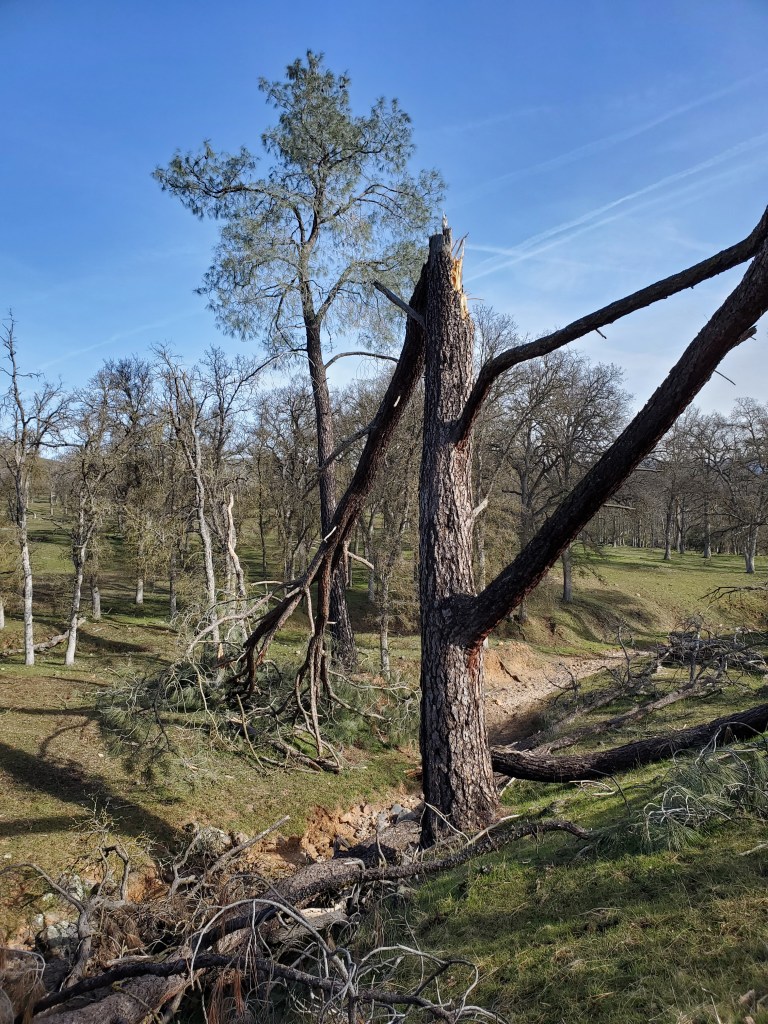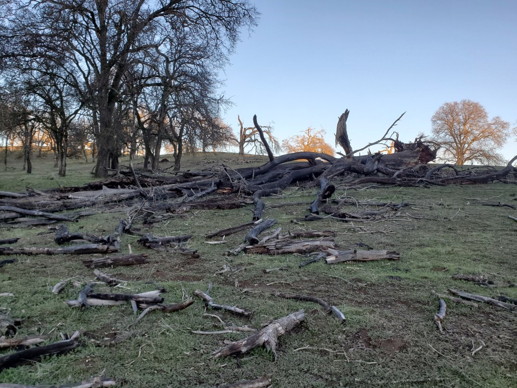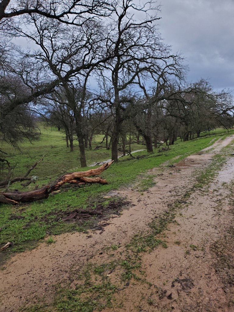 As noted in the passage above about narrowleaf planting, an oak branch had fallen on my exclusion fencing. The storm had also knocked down some branches and trees across the neighbor’s section of the cattle road. David and I ended up doing a bit of chainsaw work too.