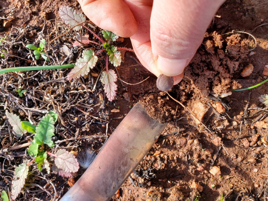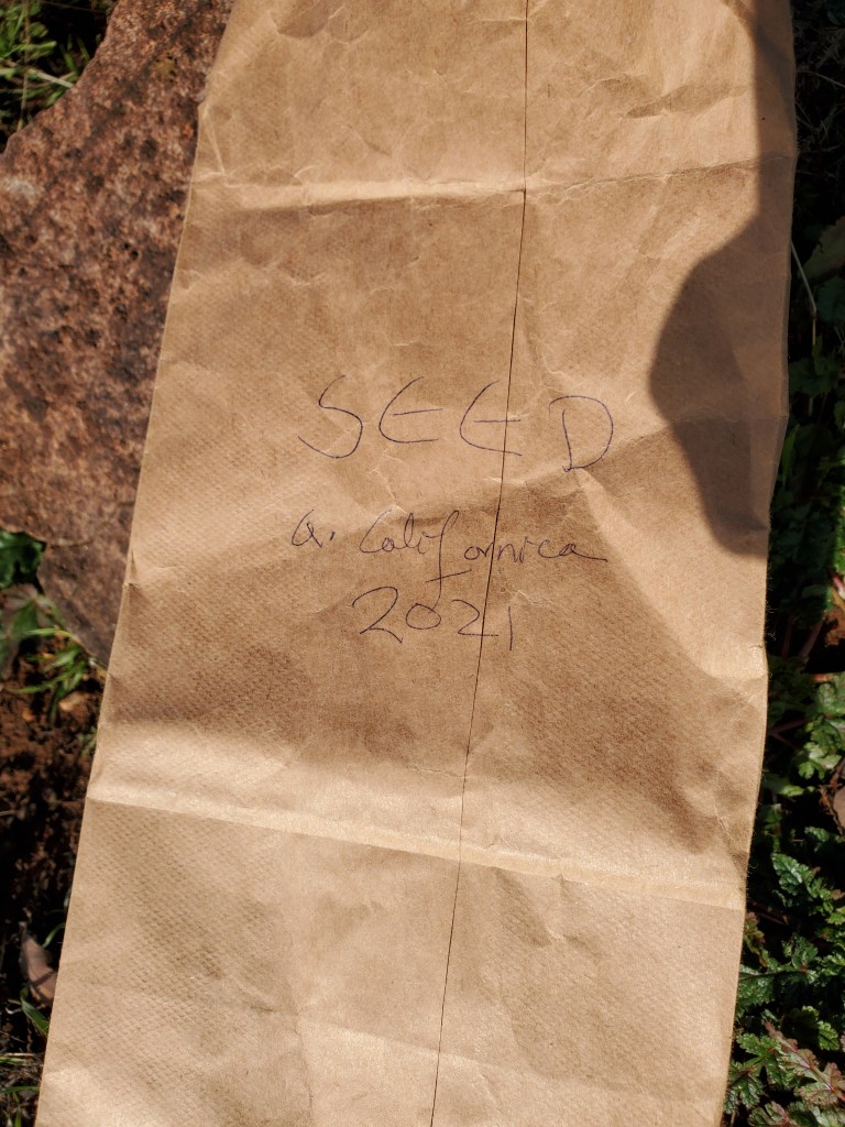 I shuttered with delight as I walked out into the cold air, overalls on, before the sun came up and with all intent to finish planting before the rain began. At a time in the past, one of the biologists told me that there was some evidence that 2 to 3 year old California milkweed seed had higher germination rates. In 2023 and 2024, the seed pods I saved from the ravages of the grasshoppers were intended for planting a year or two or three later. The 2023’s were maintained in a cool, dry, dark place for a nearly 2 years. The 2024’s were were maintained the same, but for just two seasons. I brought them both with me, including my trusty small rake.