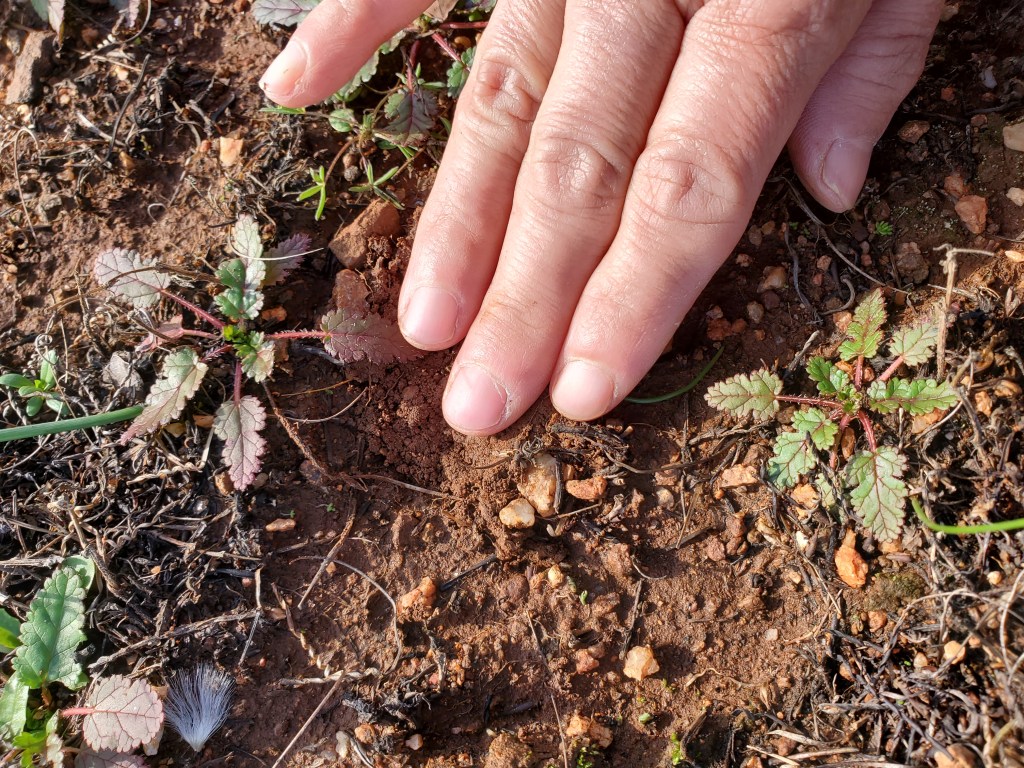 I made my way up the steep slope to the California milkweed site to plant seeds. My goal is to expand the number of California Milkweed plants. I want them to spread all the way across the hillside acting as a welcome roadside respite for monarchs, a first or second stop on their great migration. I looked for new spots to plant. Last year, I planted the 2022 California milkweed seeds, and I wanted to avoid those locations. I chose the area of the single plant community near the dead oak. There were many spots near rocks, and along the same belt as the existing plants. I try to emulate what I see in nature hoping it provides a better chance for the seed to establish.