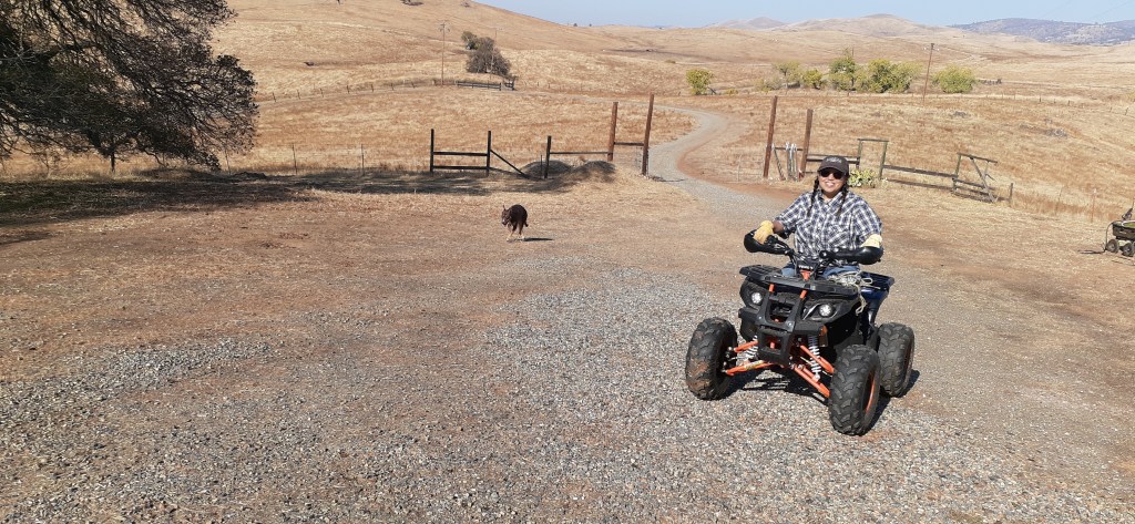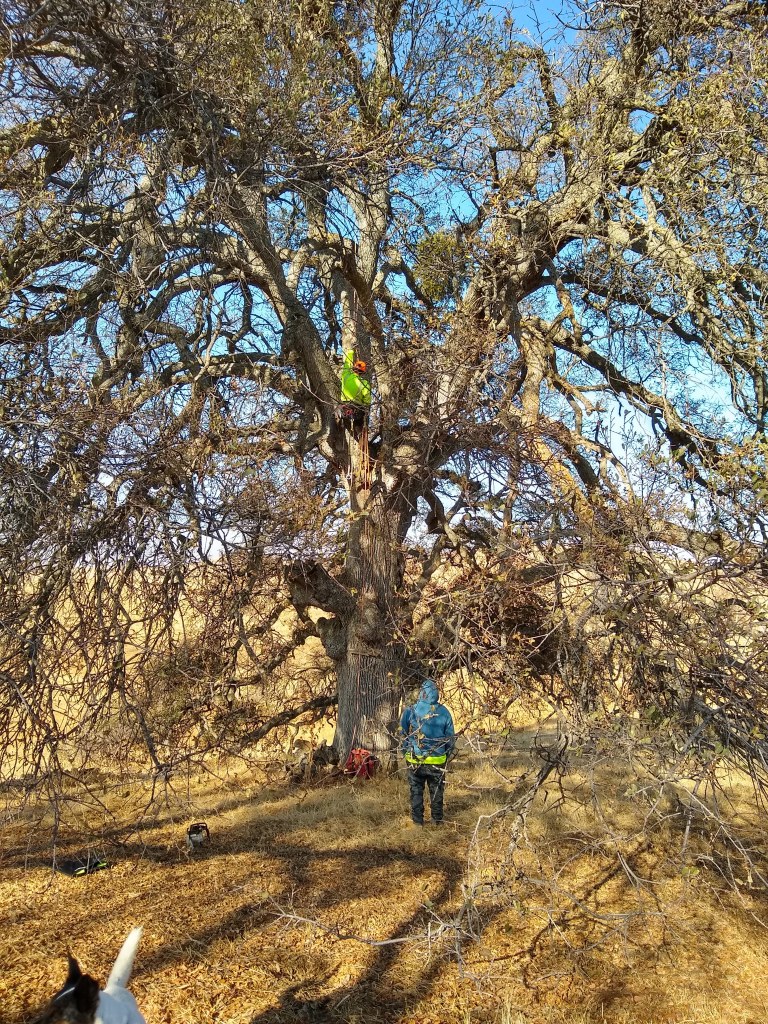 David and I have finally got all of the oaks caged. When the cows return from the south end of the ranch, the oaks are now protected. I had planted them well before the caging was done, and some of them had been stepped on or bent from hungry cow heads exploring their ability to access the tasty acorn and tree. The trees are small enough that the tallness of the basket protected them. That said, I needed to do a bit of reshaping before caging the area around the plant. We followed a new protocol for caging that Alex Palmerlee, an oak expert in Butte County follows. We used much stiffer cow panel fencing at at length of 8′ and a height of 50″ secured to two t-posts. Previously, we used no-climb fencing at a thinner gauge with a much larger diameter. The thinness required three t-posts to secure. I think this new method will require less resources and be more resistant to pushing in from the cows, thus OK to have a shorter diameter. Thank you to my long-suffering husband for doing the major share of the caging work. After I maintained the oak planting site by weeding, re-situating coir pads and “fluffing” the baskets back to their original shape, David would follow with the caging. I had already set out the t-posts for him, and he brought the panels. We make a pretty good team.